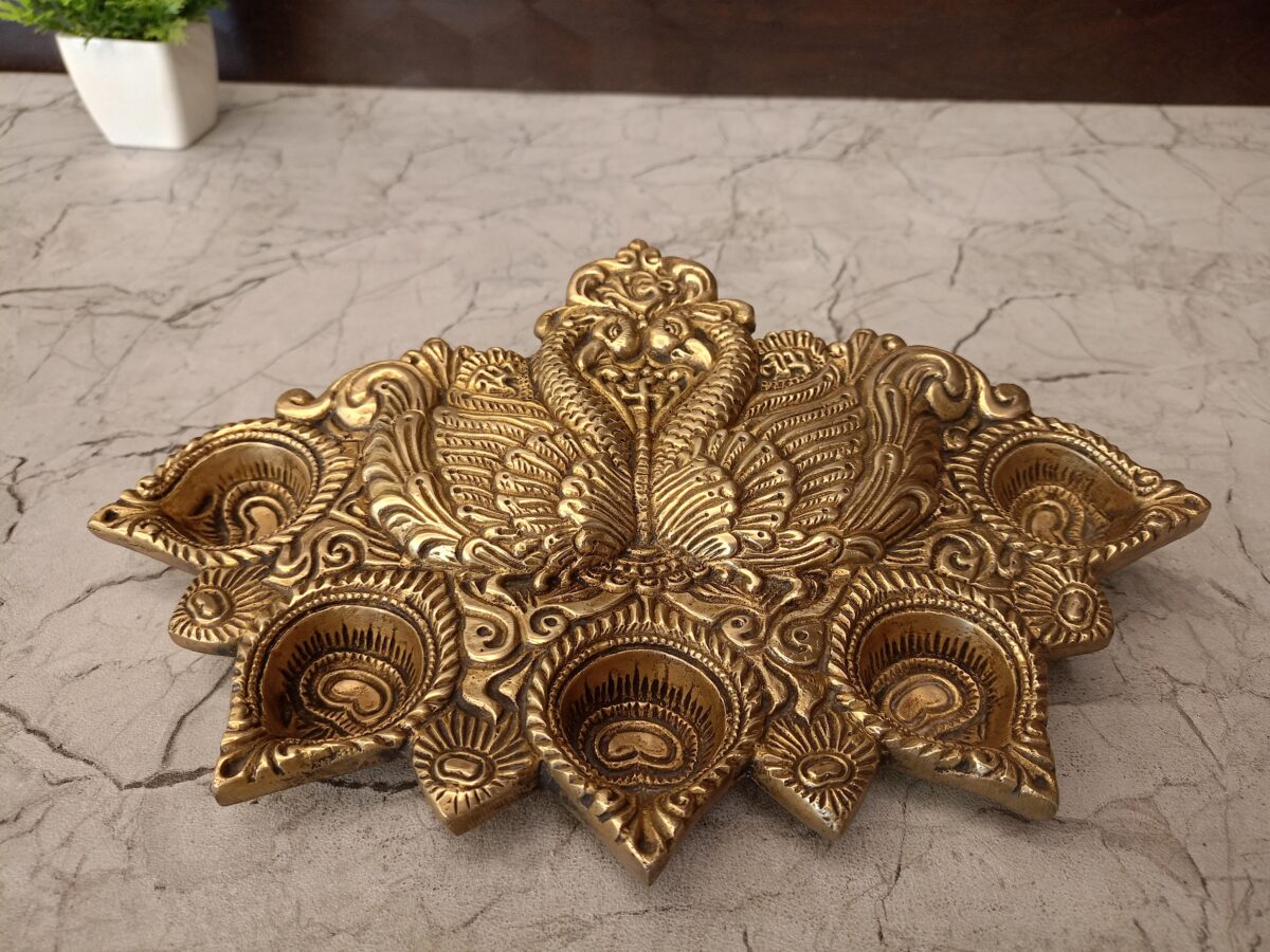- Symbolism of the Peacock: The peacock (Mayura) is a powerful symbol in Hinduism. It is the vehicle (vahana) of several deities, including Lord Murugan (Kartikeya) and Goddess Saraswati, the deity of knowledge and the arts. The peacock is also associated with Lord Krishna, who is famously depicted with a peacock feather in his crown. The presence of the peacock design on the diya symbolizes purity, beauty, grace, and prosperity. It is believed to bring good fortune and positive energy into the home.