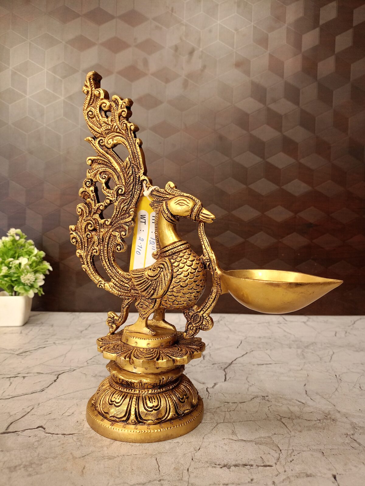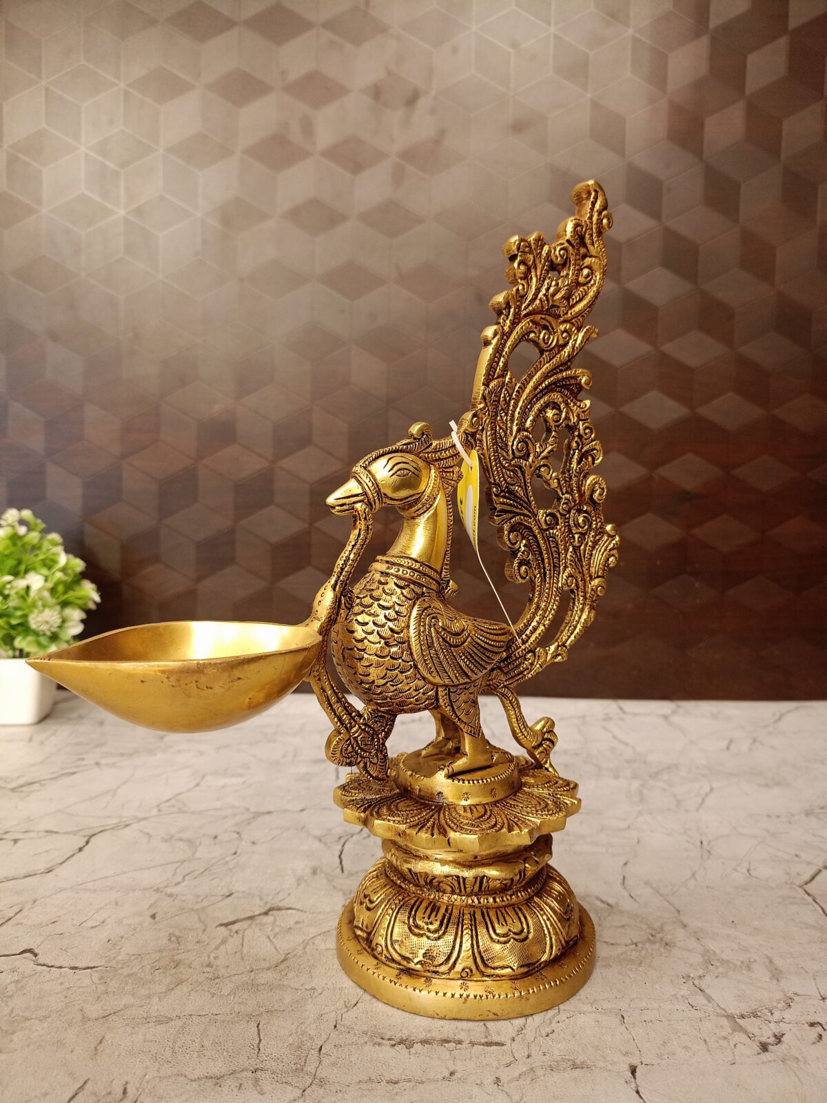 - The Diya Bowl (Held by the Beak): The delicate manner in which the peacock holds the light is a designer touch that emphasizes the concept of the peacock (symbol of the enlightened soul) carrying or delivering the divine light/knowledge to the devotee.