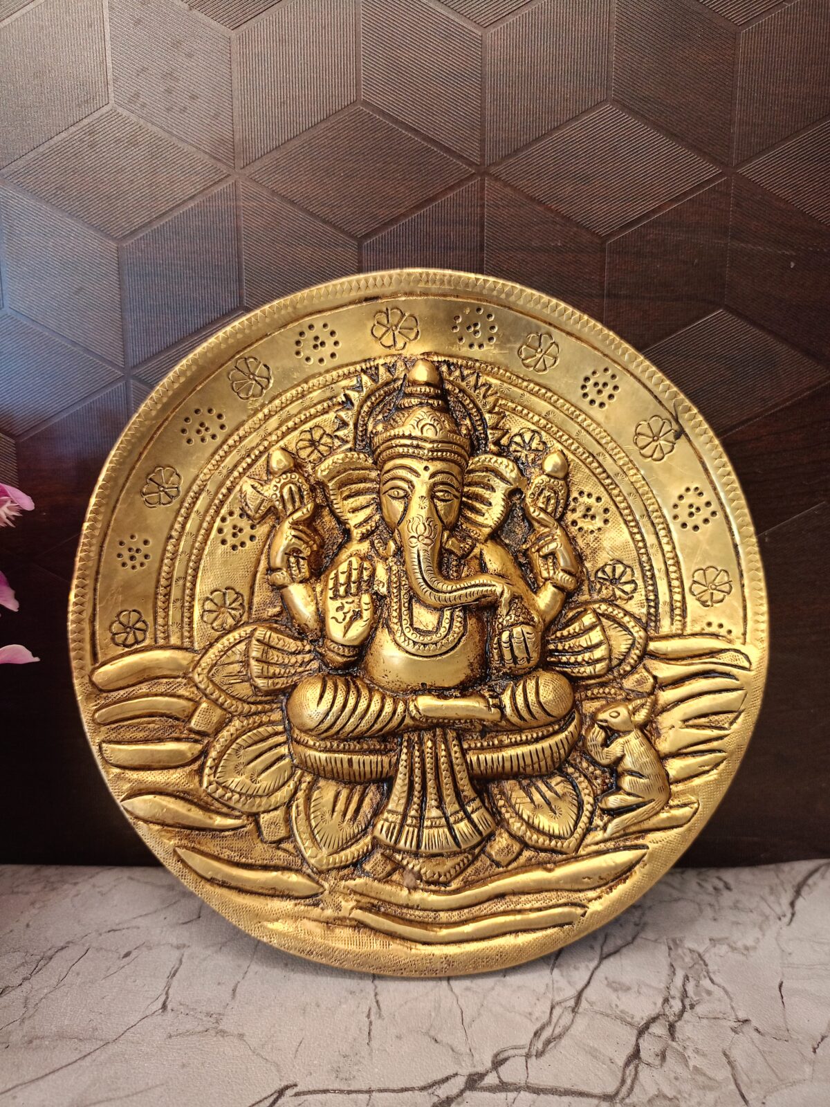 The image you provided is a brass, round-shaped wall hanging featuring Lord Ganesha. This type of decorative piece, also known as a wall plate, is highly popular in Hindu homes and offices for both its aesthetic appeal and spiritual significance.