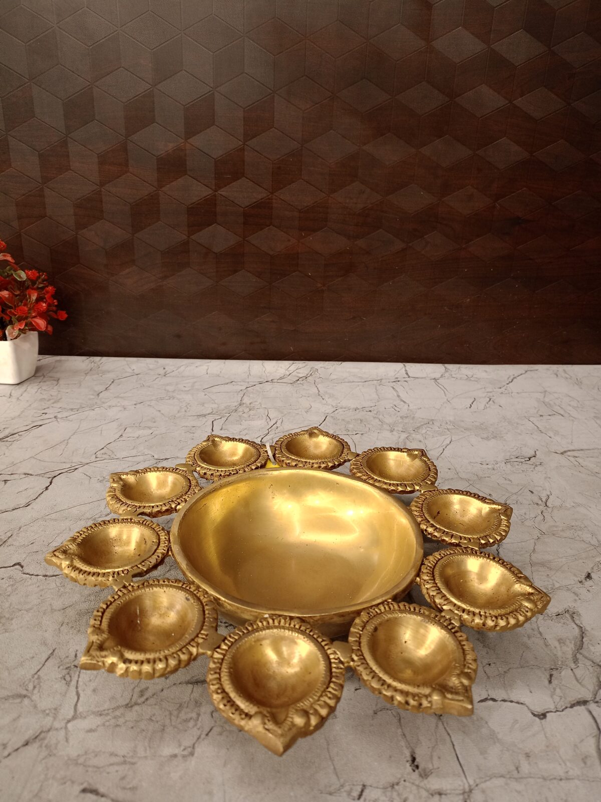 The Uruli With Diyas (or Urli Brass Decor Bowl with multiple oil lamps) is a composite piece that elegantly merges two highly significant elements of South Indian tradition ,