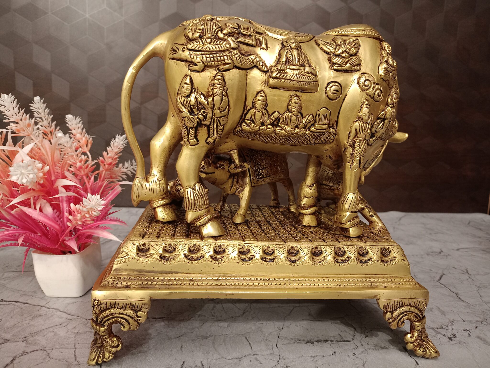 • All Gods: The intricate carvings of numerous deities on the cow’s body visually represent the core belief that Kamadhenu is the earthly embodiment of all gods and goddesses. This makes the idol a complete source of divine blessings.