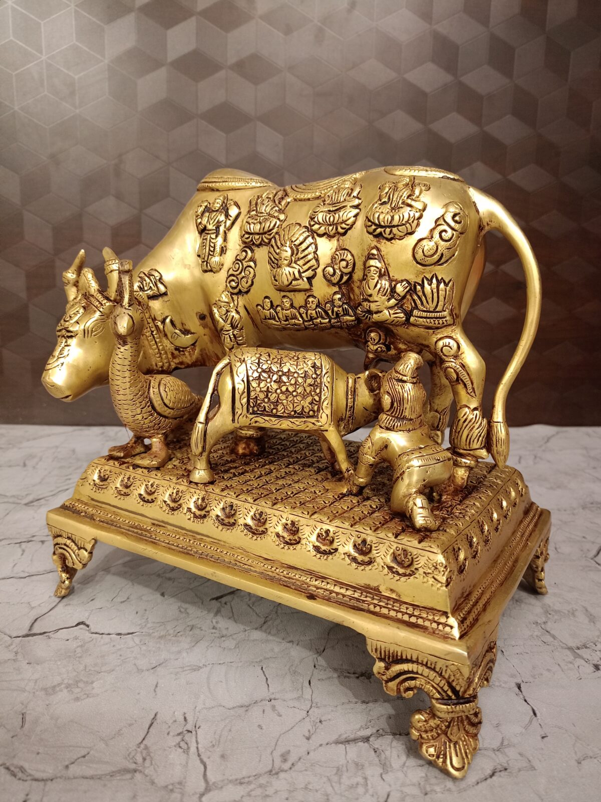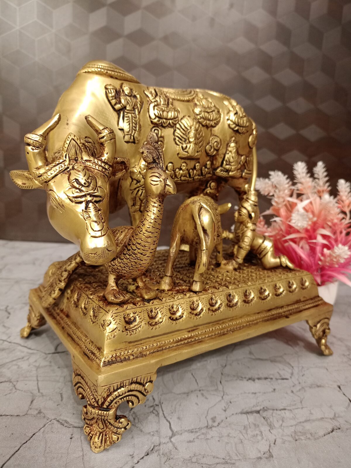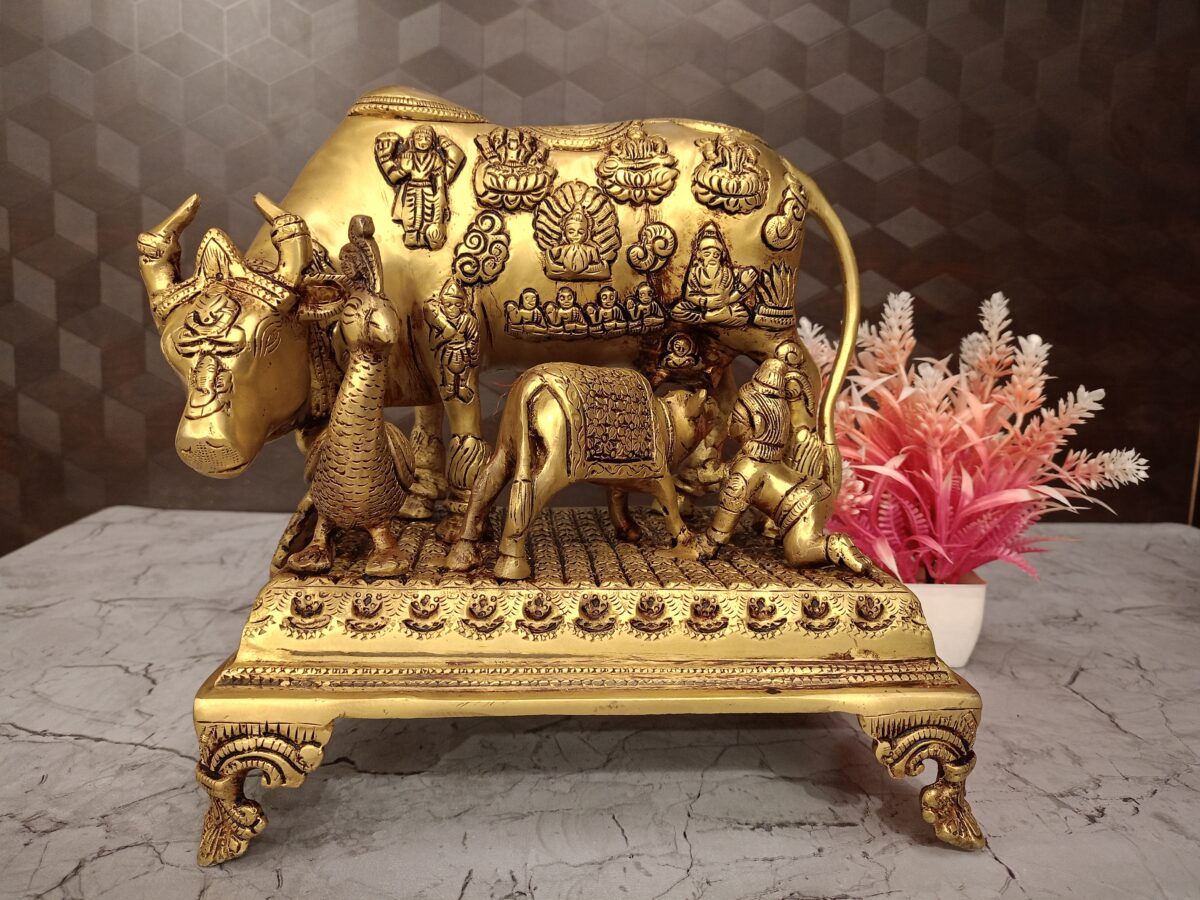 Buy Brass Cow And Calf With All Gods With Peacock And Krishna 9.5″