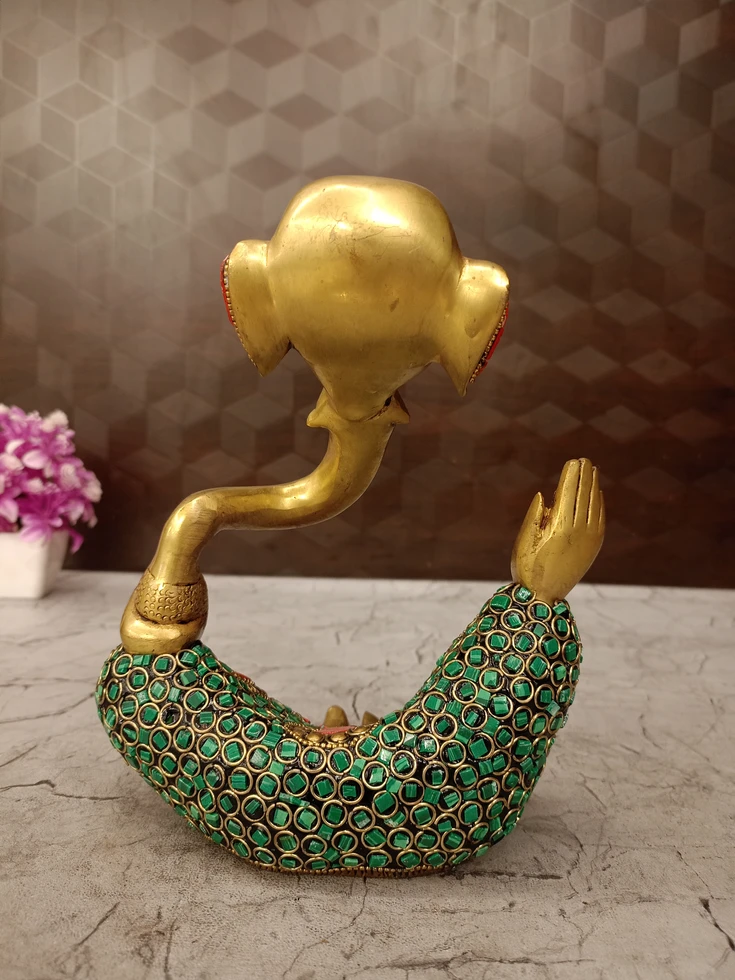 Bring home divine blessings with this beautifully crafted Brass Modern Ganesh Idol featuring an elegant stone-studded finish. Designed with artistic detailing and a contemporary touch, this 8-inch idol perfectly blends tradition with modern décor aesthetics. The vibrant green stone work and antique gold finish make it a stunning centerpiece for any space.